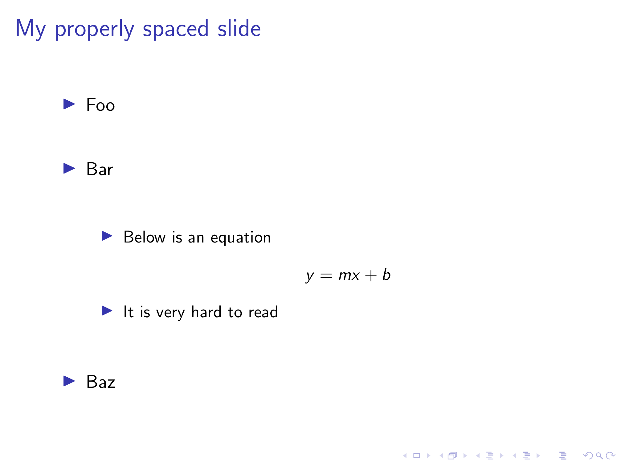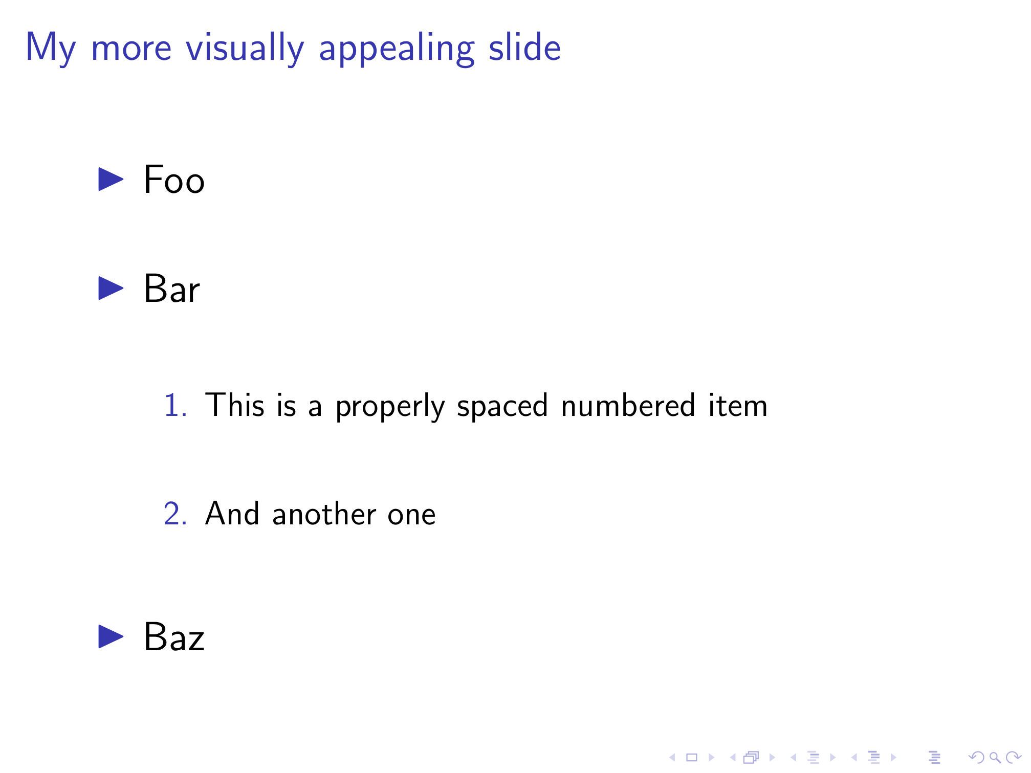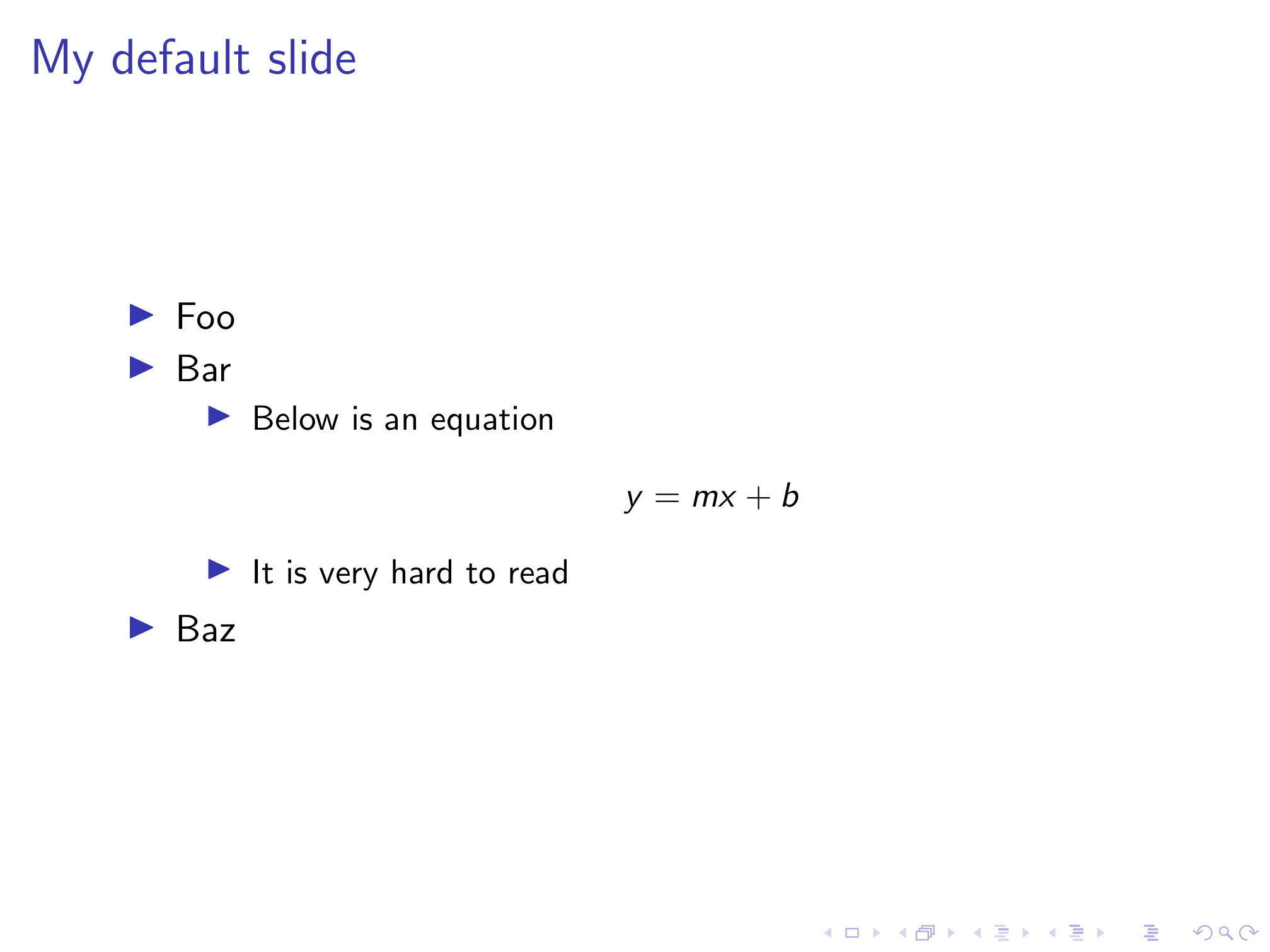 We’ll start with the base Beamer class. There are a number of Beamer themes that are much better than the default theme, but I’m going to focus on things we can do to improve even the default theme. Here’s our humble starting point.