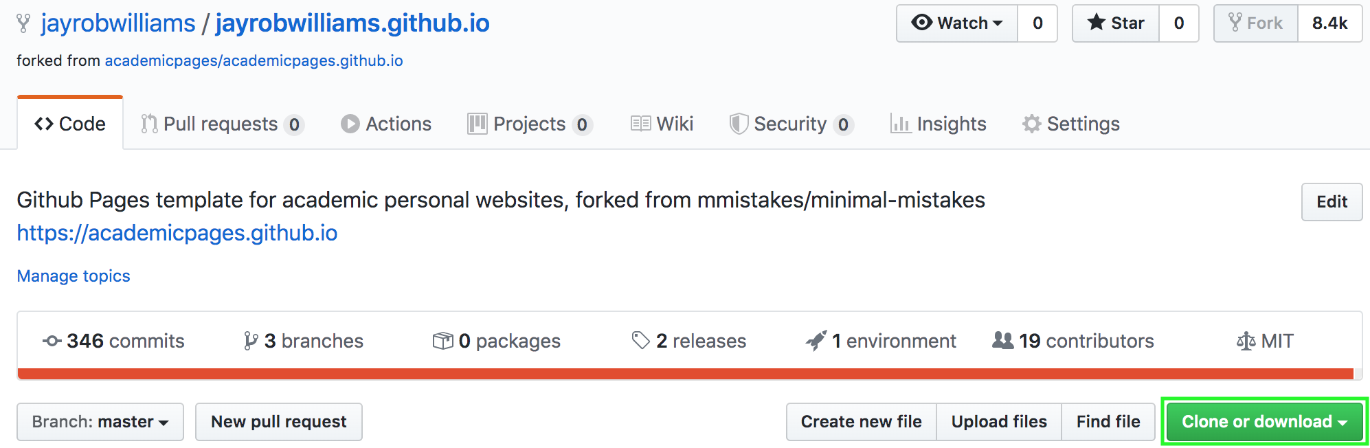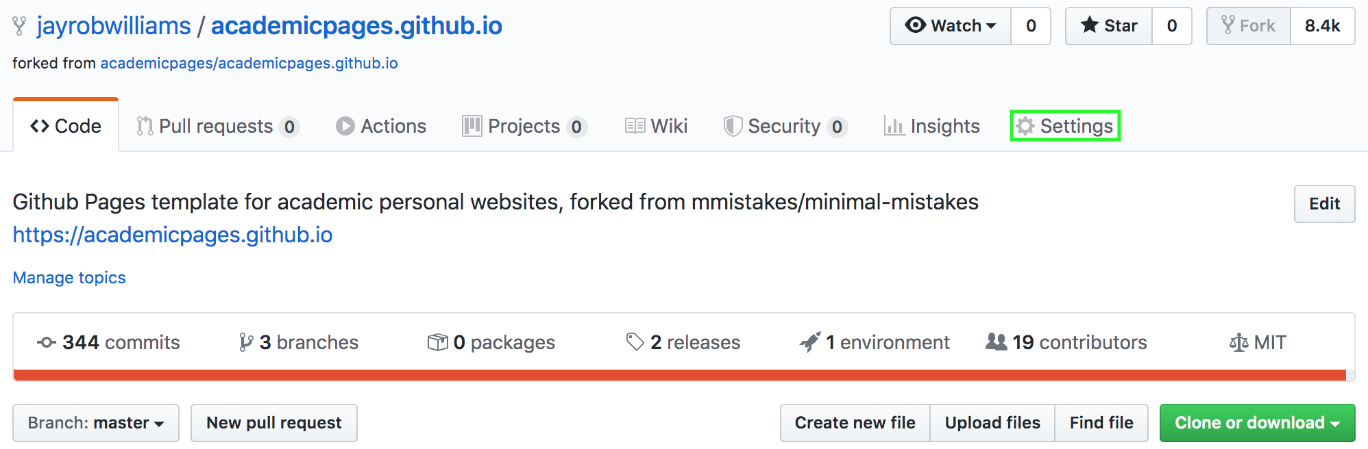 After a brief wait (and an amusing GIF), you’ll land at your forked copy of the repo. If you look closely, you’ll notice that the name in the top left has changed. Where it originally said “academicpages/academicpages.github.io” it should now read “<yourusername>/academicpages.github.io”. As you can see below, for me this is now “jayrobwilliams/academicpages.github.io”. We need to change this! Not just so people know that this is your website, but to get it online. Click the Settings button with the icon (highlighted in green below).