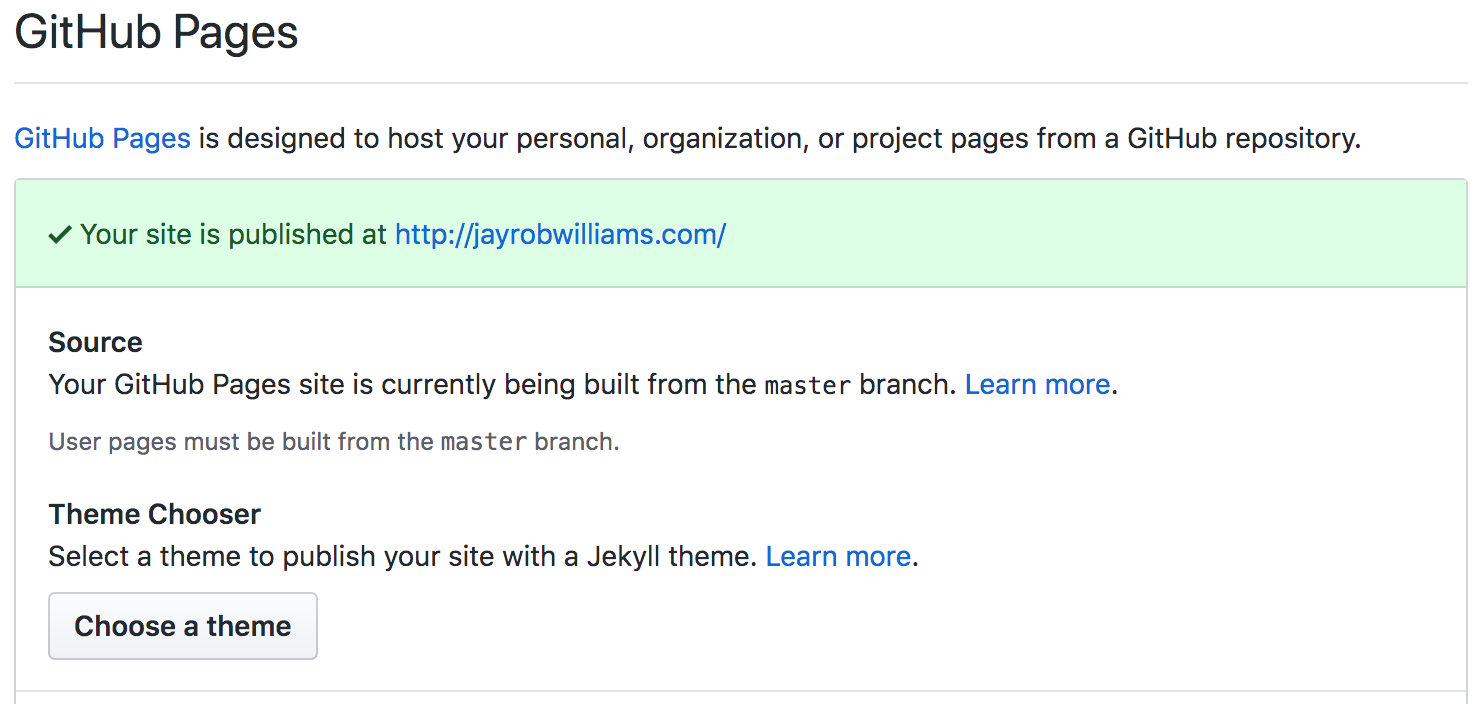 You’ll notice that the URL for my site is http:/jayrobwilliams.com, not http:/jayrobwilliams.github.io. That’s because I’ve bought a custom domain name for my site. While this does make your website seem slightly more profession, it’s not free (unlike .github.io) and it can be a little tricky to set up. I’ll cover how to get a custom domain name for your site in a future post.