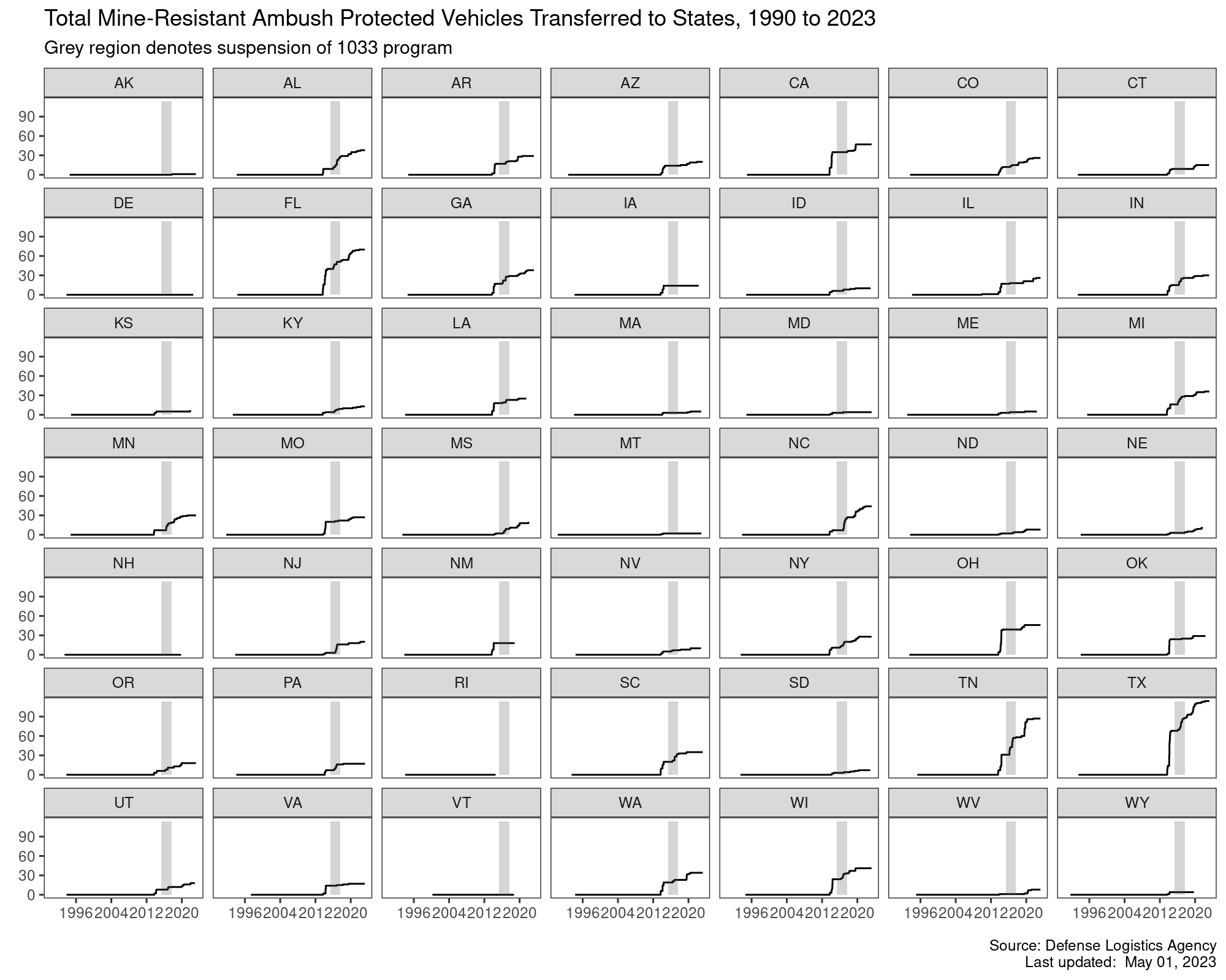 By 2023 only 4 states have not received a single MRAP (Hawaii is not included in the data from DLA, although the Marshall Project’s database records that the FBI has received 3). The grey band in each panel of the plot marks the suspension of the 1033 program from 2014 to 2017. While some states like Connecticut and New Mexico demonstrate a freeze in transfers during this period, others like Tennessee and New Jersey continued to receive multiple vehicles. To date, the state that has received the most MRAPs is Texas with a whopping 114 vehicles.